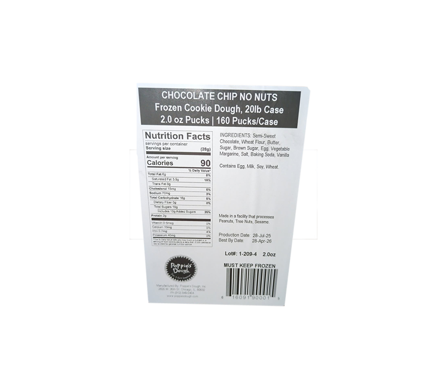 The Chocolate Chip Cookie, weighing 2 oz each, comes in a package containing 160 cookies. Bursting with rich chocolate chips and a soft, chewy texture, these cookies offer a classic and indulgent treat for any occasion. Ideal for satisfying sweet cravings or serving at events, these cookies are sure to delight customers with their timeless flavor and comforting appeal.